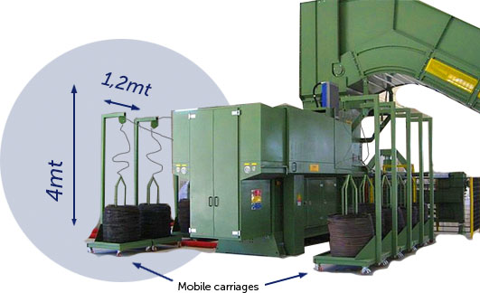 - Benutzerfreundlichkeit mit XSystem: Der Kunde kann die Palette mit dem XSystem direkt unter die Presse stellen, wodurch keine Rollplattform erforderlich ist. Dieses System gewährleistet ein reibungsloses Abrollen des Drahtes ohne Fehlstellungen oder Blockierungen.