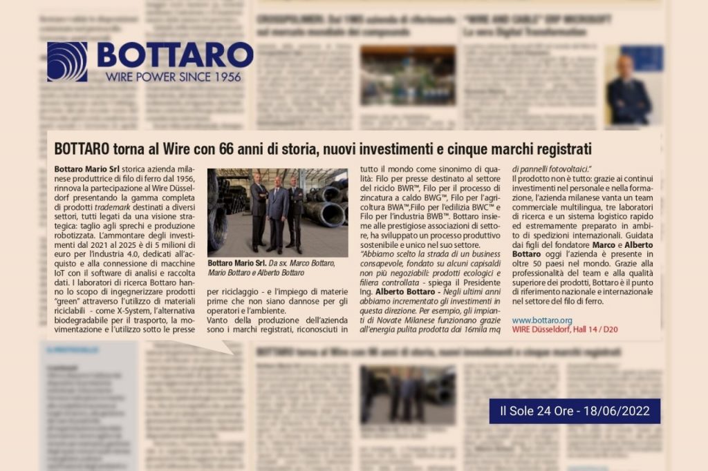 In occasione della partecipazione alla fiera Wire & Tube di Düsseldorf, il Sole 24 Ore ha scelto di raccontare la storia di Bottaro, tra produzione robotizzata, investimenti in energia pulita, filiera green e prodotti trademark.